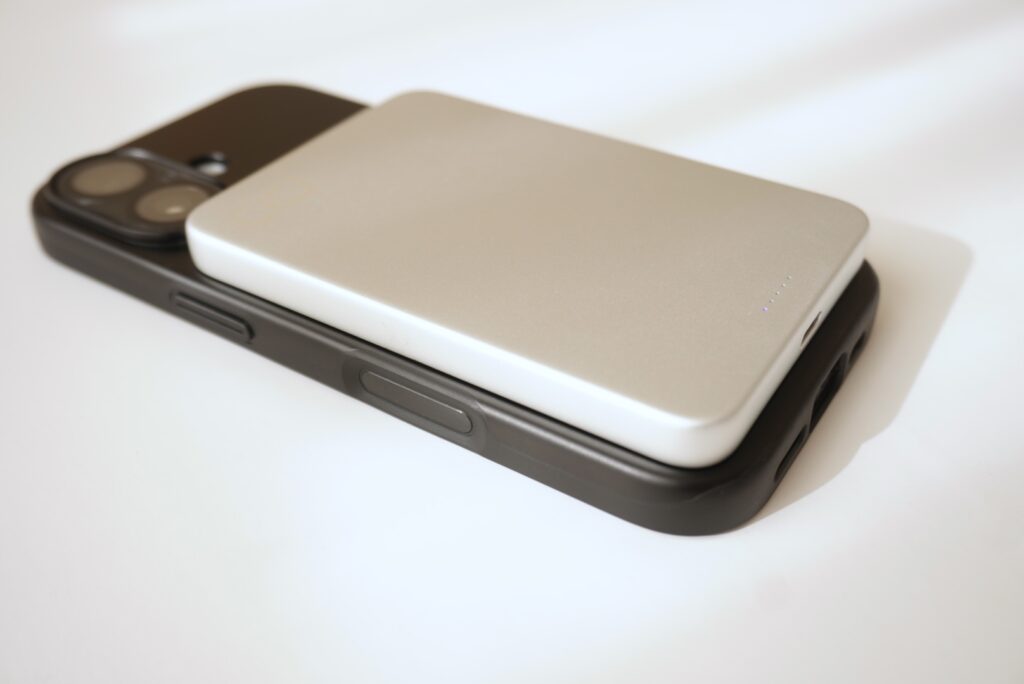 スマホ(対応機種)をバッテリーに“ピタッ”とくっつけるだけで充電開始、というのはケーブルを探すストレスを劇的に減らしてくれます。ワイヤレス充電にありがちな「ケーブル抜き差し」の煩わしさがないのはやはり便利です。